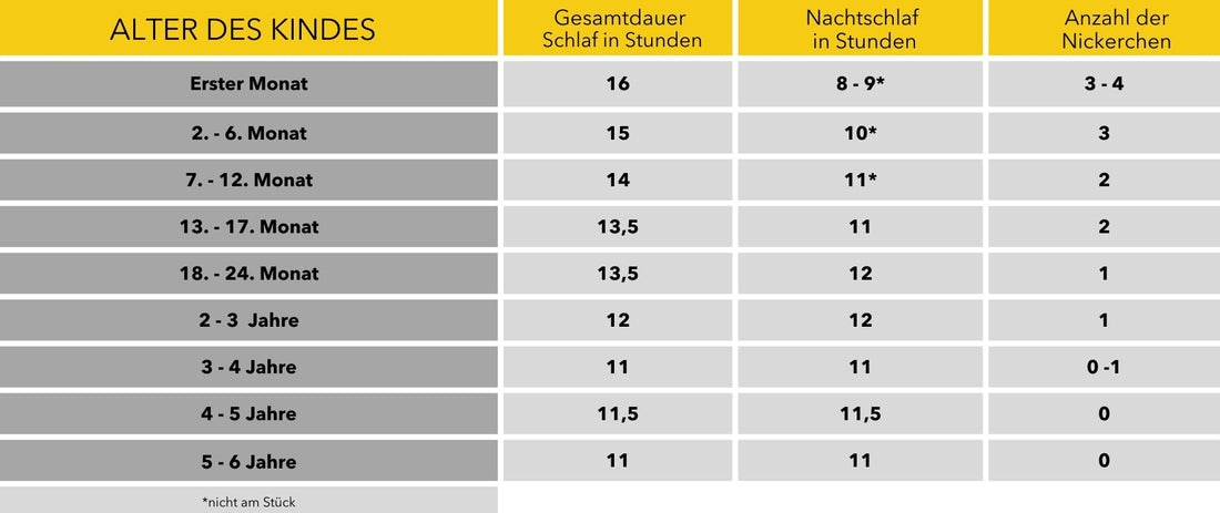 Irgendwann, meist zwischen dem neunten und achtzehnten Monat, stellen Kinder ihr Schlafmuster um und schlafen nur noch einmal am Tag. Es gibt Kinder, die nachmittags drei Stunden schlafen und trotzdem abends um 19 Uhr wieder bettreif sind.